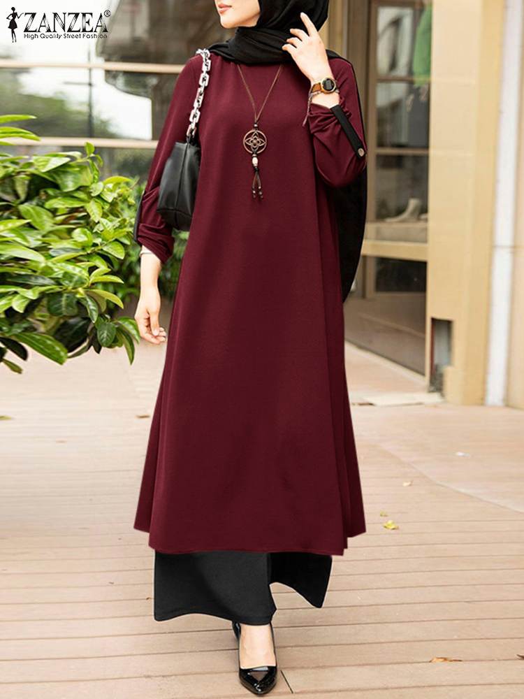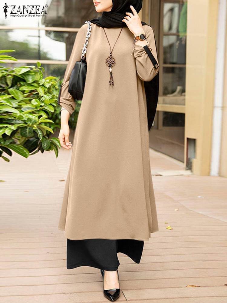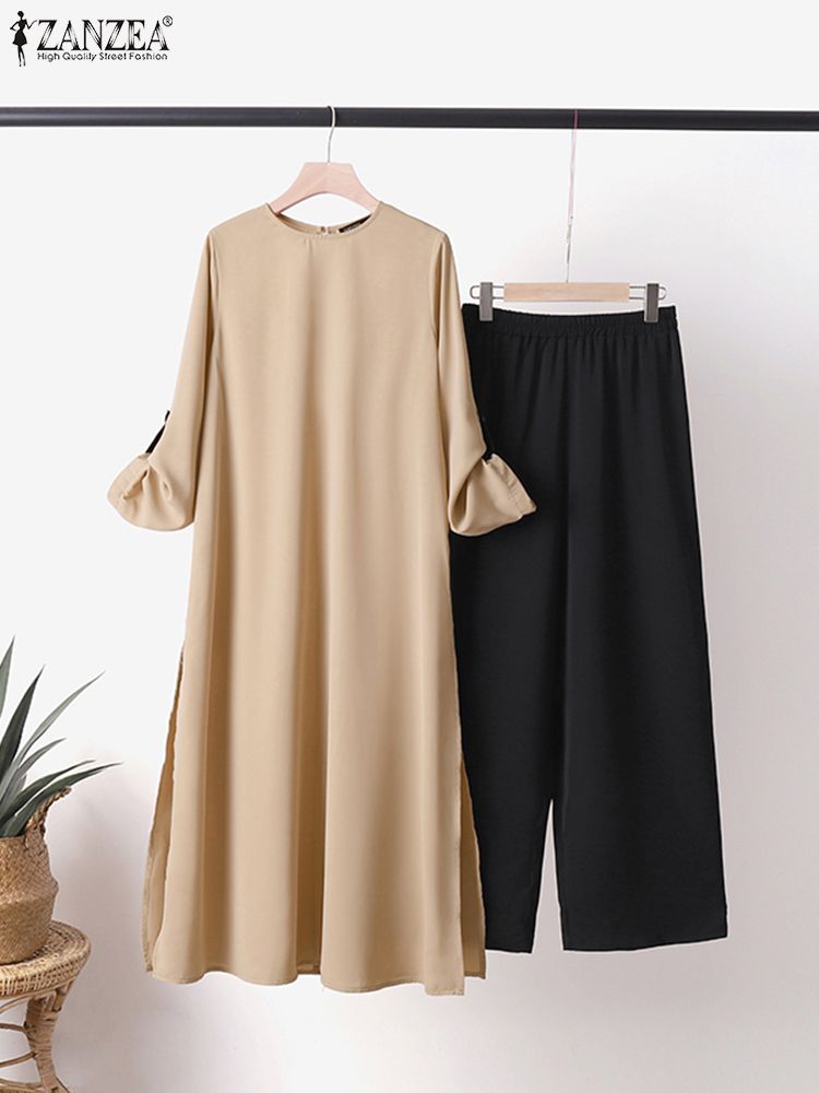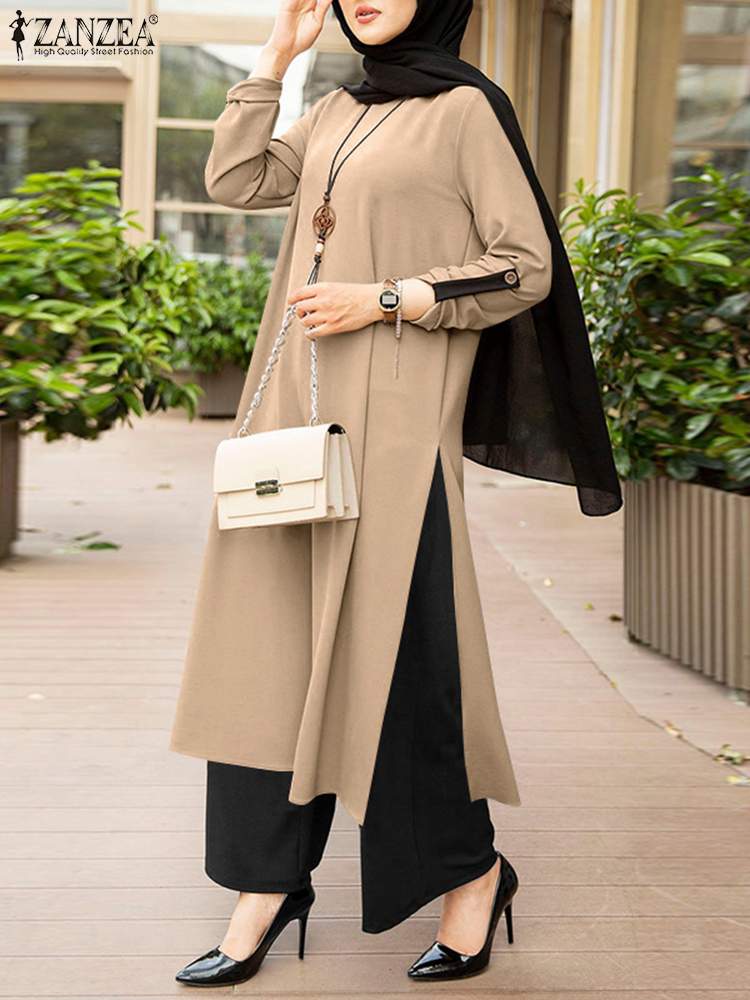 ZANZEA Muslim Womens Outifits Casual Urban Tracksuit Two Piece Sets Loose Suits Vintage Long Shirt Wide Leg Pants Sets