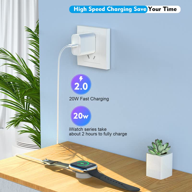 6.6FT Apple Watch Charger Cable for Apple Watch come with 20W USB C Wall Apple iPhone Watch Charger Travel Plug Adapter Specifications of Apple iPhone Watch Charger: Input :100-240V ~50/60Hz 1.0A Output: 5V/1.0A Watt:20W Cable Length:6.6 FT/2M Color: White Certifications: MFI/UL/FCC Connector Type:Type C Portable & Compact: -With a lightweight and portable design, the iPhone and watch charging cord with 6.6 feet could meet travel, car, office, and wherever you need to use it. Superior Protection: -Multi-protect safety system ensures complete protection such as built-in short circuit, over current, over voltage and over temperature protection, offers you a safe charging environment. Powerful Magnetic Charging: -Strong magnetic adsorption allows you to adjust the angle freely without deviating from the charger center.After fully charging, it will automatically stop charging to protect connected device's battery from overcharging damage. Broad Universal Devices Compatible with all 38mm, 40mm, 41mm, 42mm, 44mm, 45mm, 49mm : Fits Apple Watch Series : -Apple Watch Series 9 -Apple Watch Series 8 -Apple Watch Series 7 -Apple Watch Series 6 -Apple Watch Series 5 -Apple Watch Series 4 -Apple Watch Series 3 -Apple Watch Series 2 -Apple Watch Series 1 -Apple Watch SE -Apple Watch Ultra -Apple Watch Hermes Package List -1X USB-C 20W Apple iPhone Wall Charger -1X2m/6.6ft Apple iPhone Watch Charger Cable