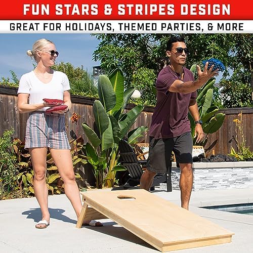 The GoSports Dual Sided Cornhole Bean Bags - Slide and Stop Regulation Tournament Bean Bags feel like good weighted bean bags for corn hole.The two sided bag has slide and stop which is great when you're an advanced player and can actually control your throws - lol (not in my world yet).The patriotic design is just what my husband wanted with red and white strips and blue and white stars.It's great on a plain surface cornhole board.Comes with heavier duty bag to store the beanbags in.