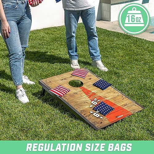 This set of GoSports premium all-weather duck cloth official cornhole bean bags is a maximum value priced alternative compared to other overpriced sets that don't hold up to the demands of Cornhole gameplay. As you continue to toss this set of bean bags season after season you will have the satisfaction every buyer loves to feel - getting more than you paid for! That's because this premium duck cloth material comes professionally double stitched for tear-free gameplay and the weather-proof plastic filling keeps this set working even in the rain. Even diehard Cornhole players love the plastic filling that feels just like the original corn filling, but now without having to deal with mold, decay, and attracting critters! This long lasting value set even meets the regulation size and weight standards for Cornhole so you can use them in tailgating, camping, practice, competition, and just at home. As an added bonus, this GoSports Bean Bag Set comes with a convenient tote bag to carry and store your set until the next game. You won't find such a great bundle deal anywhere else!