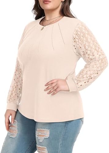 OLRIK Plus Size Tops for Women Lace Long Sleeve Waffle Knit Shirts Casual Loose Fit Blouse (1X-4X)