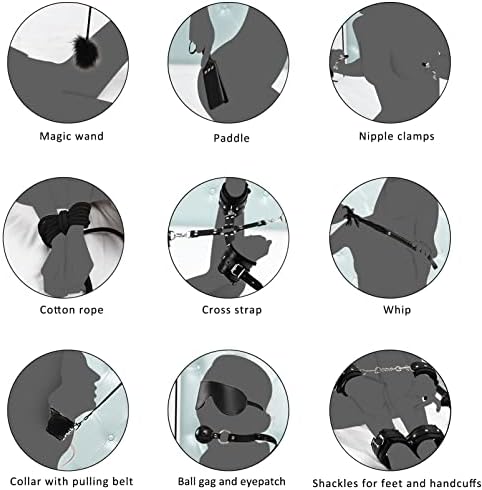 Information This is a 11-in-1 suit of sex toys with the scientific design for couples' SM games playing. We adopt the superior and environment-friendly PU leather to make this suit of toy, which is quite soft and comfortable to wear and suitable for beginners. This product is of great quality and durable in use. Moreover, it won’t lose its color due to sweat or water. Complete sex toys to add funs to your sex life, you deserve to have them! Feature Material: PU leather & nylon & stainless steel Gender: unisex Suit: handcuffs, shackles, whip, cotton rope, mouth plug, nipple clamps, plumage, collar, cross strap, blinder, paddle Weight: 24.7oz/700g Color: black Package list: 11 pcs of sex toys Notice * The actual color may vary slightly from the online image due to monitor color settings. * Please allow slight measurement deviation for the data. Package Including 11 pcs of sex toys