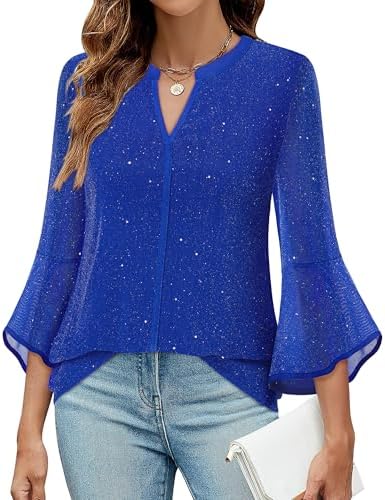 VALOLIA Women's 3/4 Sleeve Dressy Blouses Shirts Casual Loose Fit Mesh Layered Flowy Tunic Tops